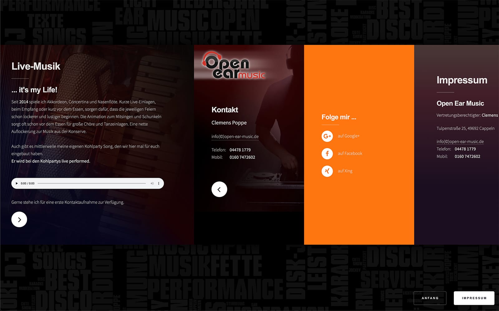 Schauen Sie sich die Seite an, scrollen Sie durch die wichtigsten Passagen und hören Sie sich unbedingt den Soundtrack an, der ebenfalls von mir aufgenommen, gemixt und gemastert wurde. Sie werden mit Sicherheit von meinen Fähigkeiten überzeugt sein.