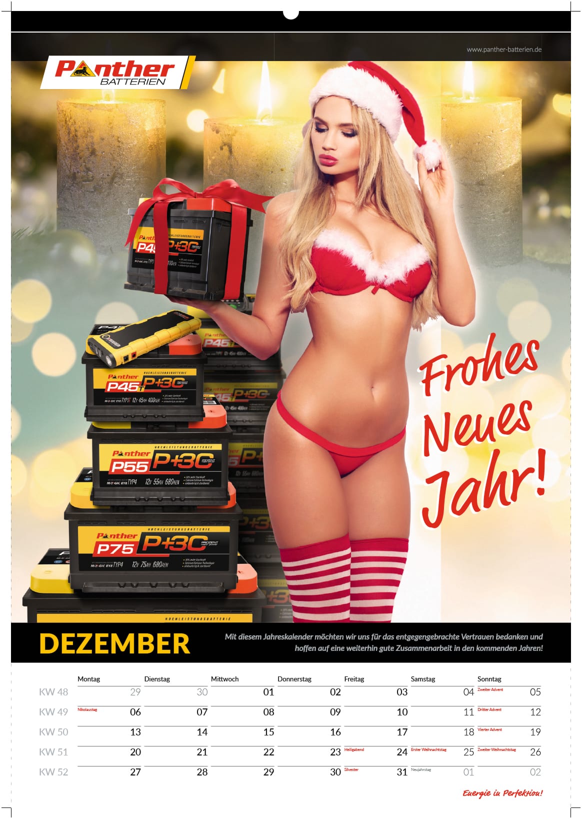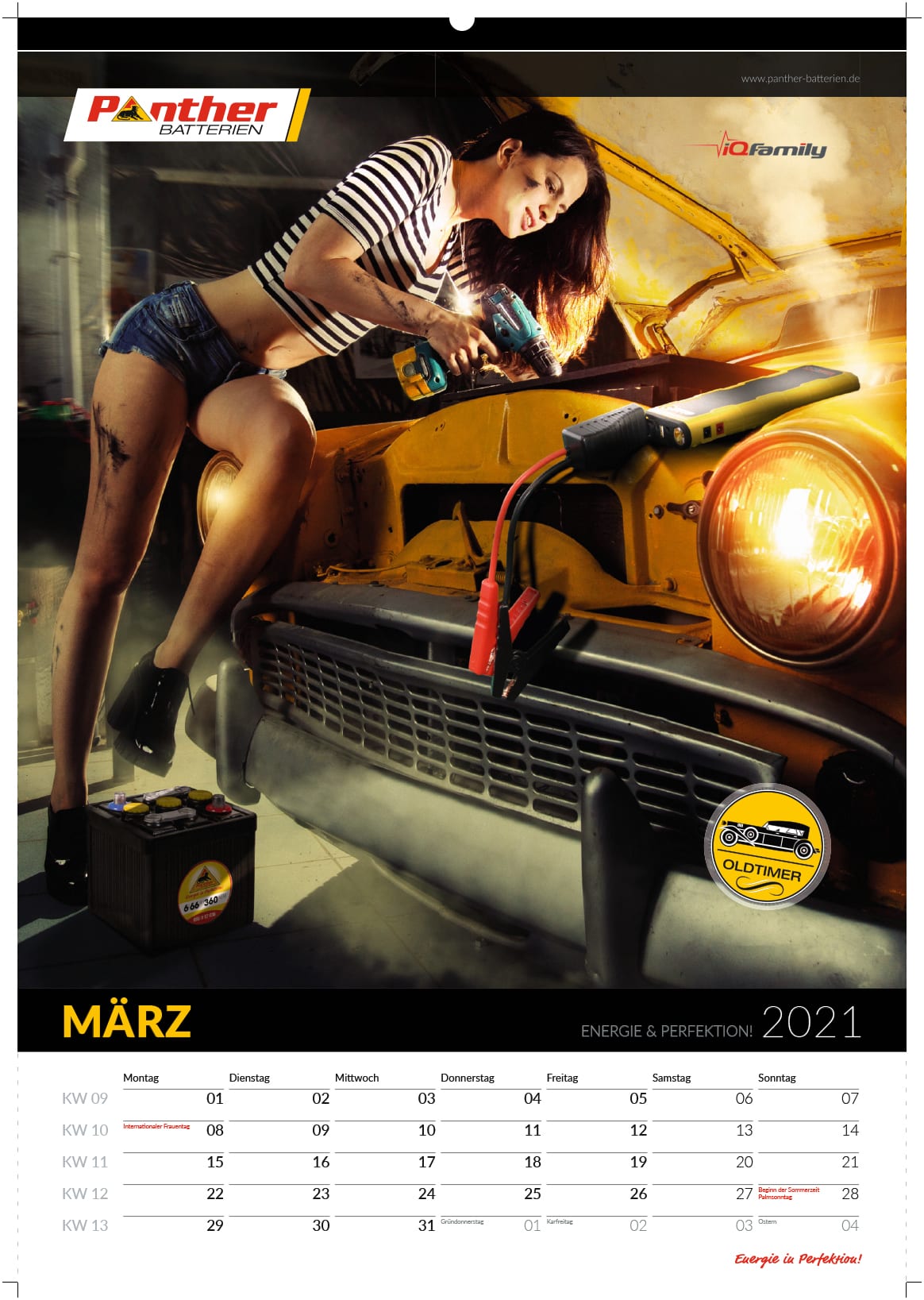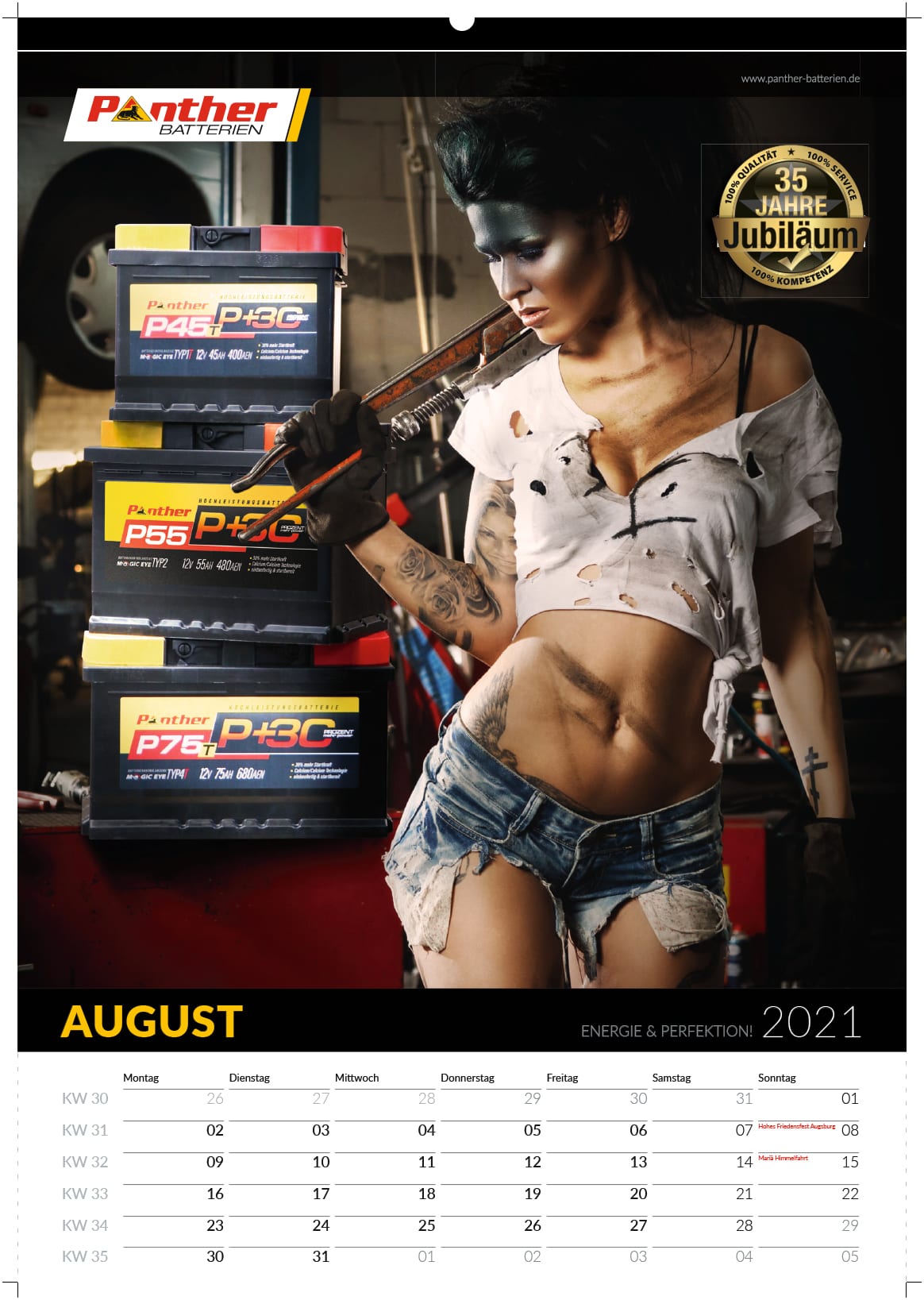 Hier ist ein Beispiel eines Werkstattkalenders der Firma Panther-Batterien, bei der ich derzeit beschäftigt bin. Den Kalender habe ich in nur drei Wochen vollständig fertiggestellt und die Druckdaten für die Produktion vorbereitet.