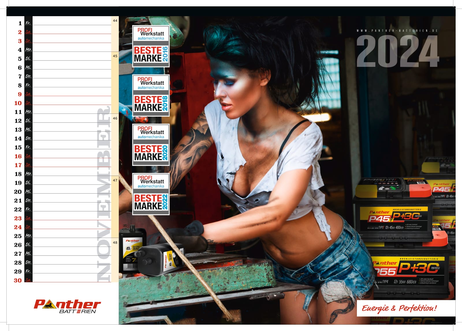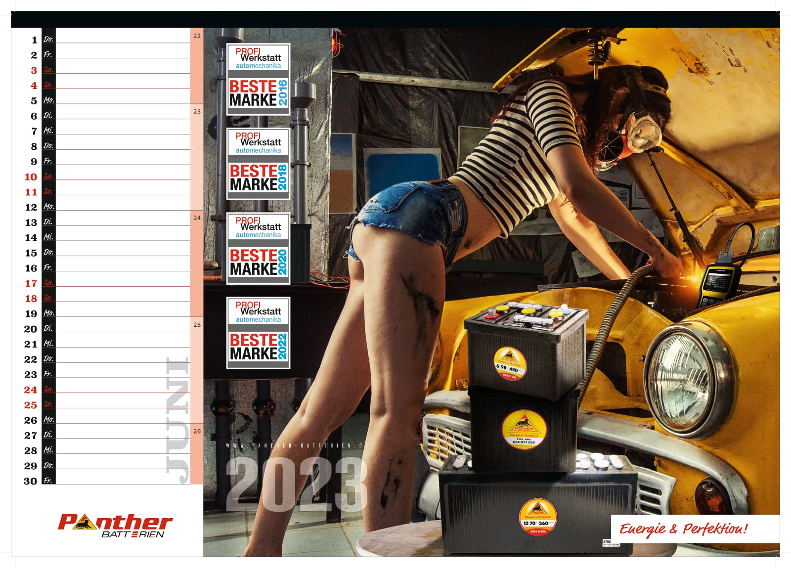 Hier ist ein Beispiel eines Werkstattkalenders der Firma Panther-Batterien, bei der ich derzeit beschäftigt bin. Der Kalender ist für zwei Jahre konzipiert, beidseitig bedruckt, und ich habe ihn innerhalb von nur vier Wochen vollständig fertiggestellt, einschließlich der Aufbereitung der Druckdaten für die Produktion.
